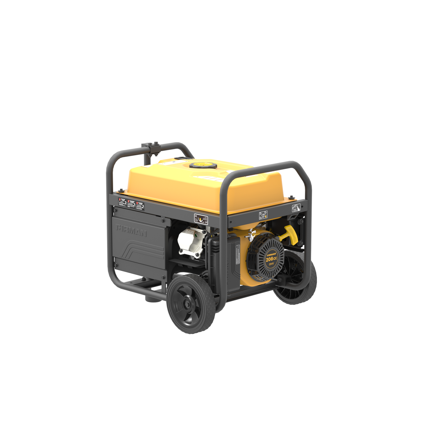 The FIRMAN Volt Lock automatic voltage regulator ensures clean, consistent power output from the FIRMAN Power Stream alternator. For the ultimate in portability the P03608 includes a wheel kit featuring 8â never-flat wheels and a high leverage single folding handle with ergonomic grip. Pertinent information is at your fingertips with our 4-in-1 data minder measuring Volts, Hertz, Hours and a low oil indicator. The durable, compact tubular roll cage frame design is built for years of use. Just add gas!